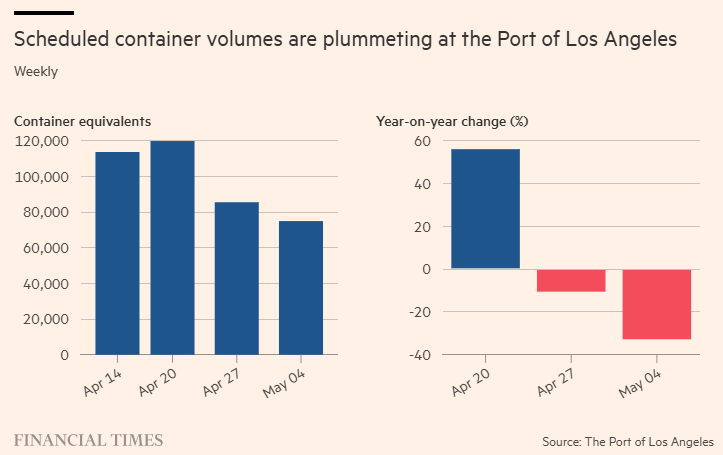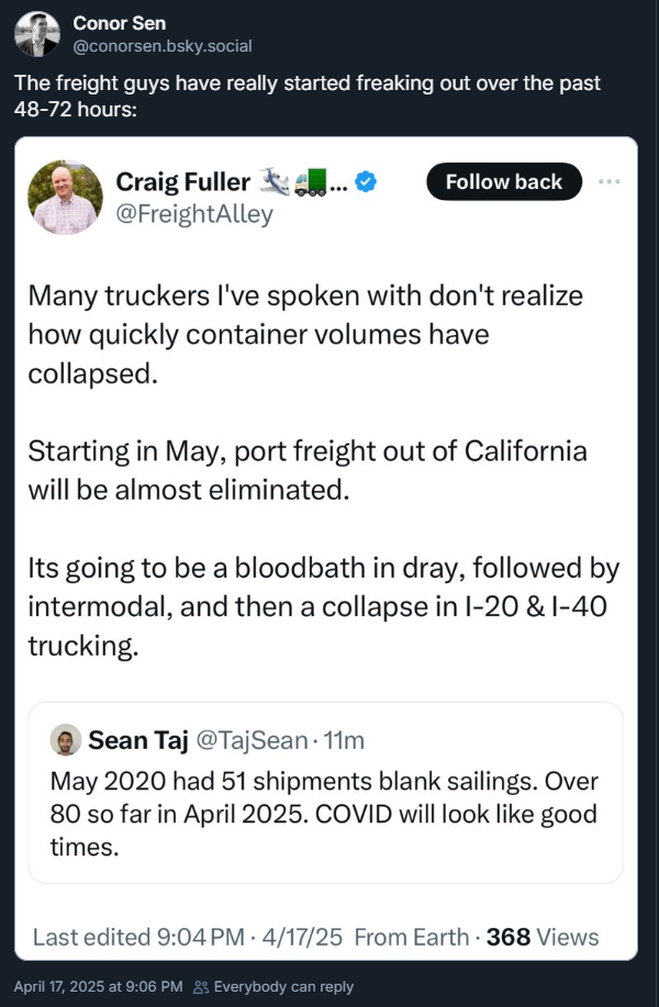 While Apple reportedly flew several planes full of iPhones to bolster inventory before tariffs fully kick in, most businesses have to rely on ocean freight to get their bulk inventory from China. That journey across the Pacific takes anywhere from 15-30 days depending on the ports in question, and that transit time has briefly delayed what's now clearly coming. In the last few weeks, business reporters and people that follow international shipping have started posting about a forthcoming cliff in inbound shipping to the US.