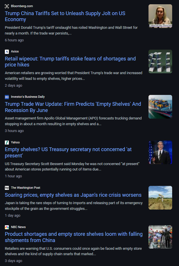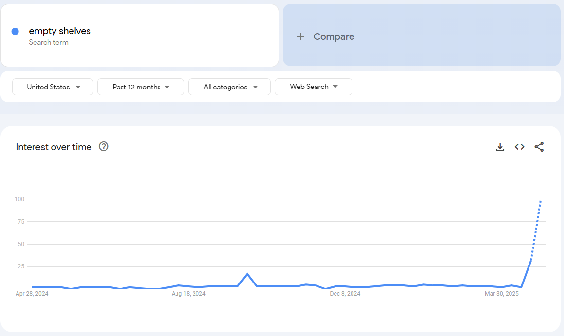 Since Donald Trump declared Liberation Day almost three weeks ago, there have been non-stop stories about the tariff rates being assessed to our trading partners. The biggest headline by far is the 145% tariff being placed on goods from China (at least as of this writing). Combined with upcoming May 2nd repeal of the de minimis exception, everything from household appliances to cheap clothing from Shein and Temu will be subject to the same import rules. Many businesses have started to sound the alarm that they will be unable to import at all with tariffs at these levels. Below is a quick sample of articles warning about potential shortages and Google Trends results for "empty shelves."