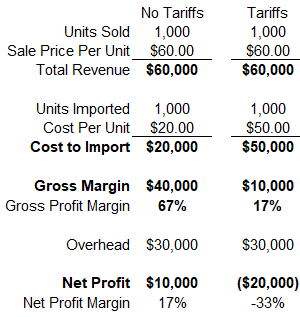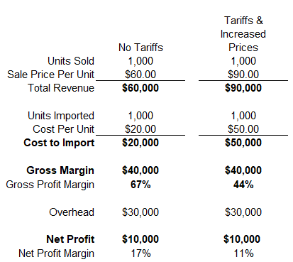Assuming our imaginary business changes nothing, the amount of money they make on newly imported inventory won't cover their overhead costs (people, rent, marketing, etc.) and they will post a loss. The example above is precisely why anyone who is being honest about tariffs will tell you that they will ultimately have to be paid by the customer. Business owners have no choice but to pass those costs on and are still taking a huge risk to bring in the inventory in the first place. In the example below, the $30 increase in unit cost has been 100% passed through to the sale price.